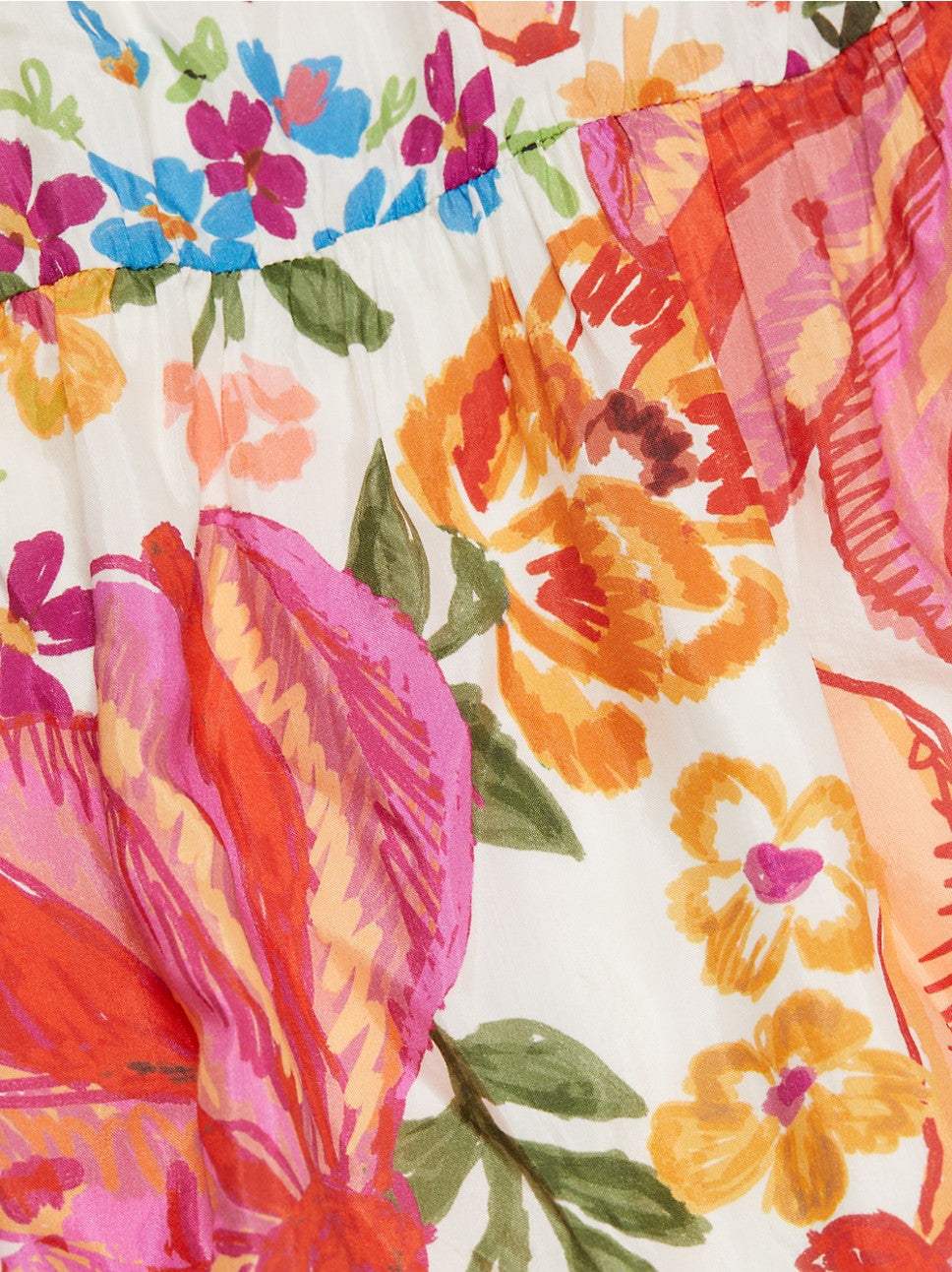 The Bananas cotton mini dress featuring hot pink, multicolour, cotton, all-over floral print, round neck, short puff sleeves, belted waist, front button fastening and ruffle hem.
