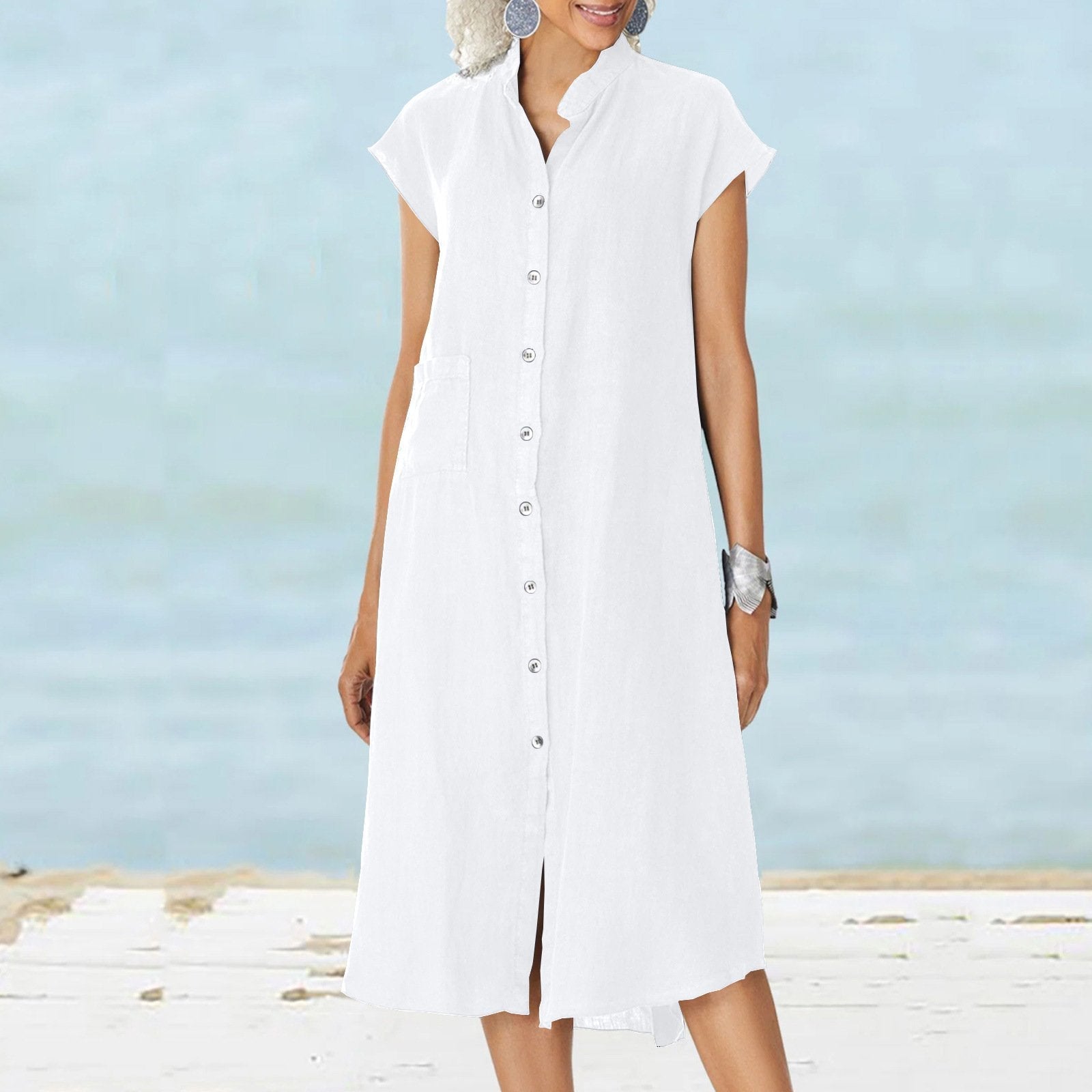 Women’s Button-down Cotton Linen Loose Dress with Pocket