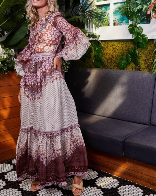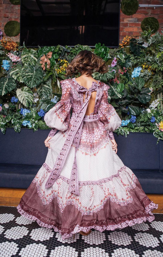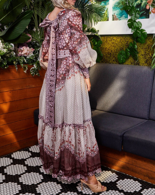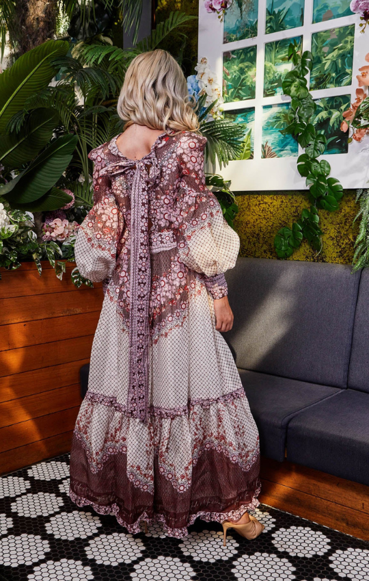 The Dress is an immersion of rich aubergine hues highlighted with lush pink flowers. A lavish array of growing vine accents framed by sleek curved lines and sharp geometric mosaics. This luxury silk dress plays host to tie detailing at the back neckline, a fitted waist, zip fastening and blouson sleeves.